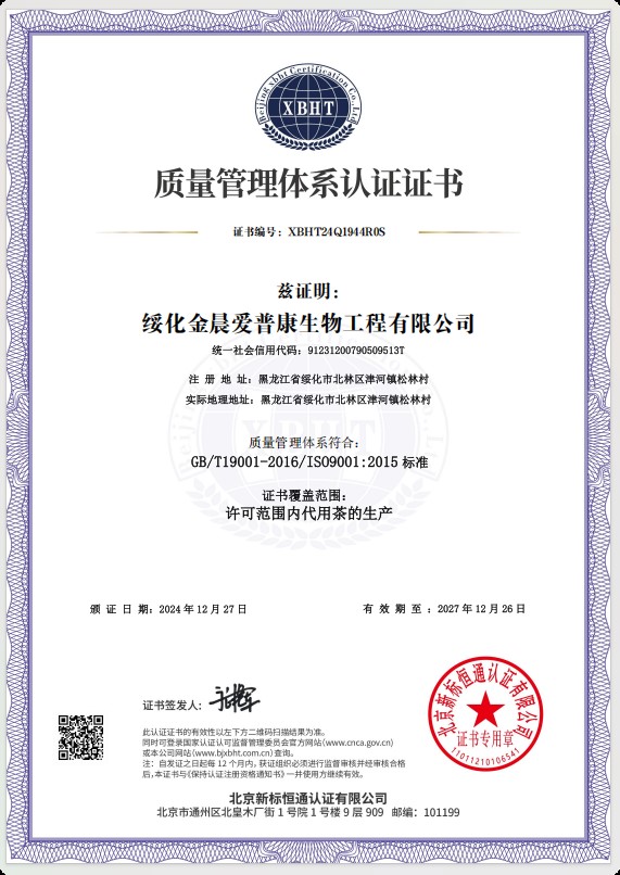 綏化金晨愛普康生物工程有限公司位于黑龍江省中南部地區的綏化市北林區,所處位置東經124度,北緯45度,位于松嫩平原的呼蘭河流域,“有寒地黑土,塞北江南”的美譽,是全國重要的商品糧基地,屬中溫帶大陸性季風氣候,四季分明,雨熱同期,冬季冰雪覆蓋,夏季降雨集中氣候溫熱濕潤。綏化金晨愛普康生物工程有限公司是一家專業(yè)從事健康養(yǎng)生產品研發(fā)、生產及銷售企業(yè),公司占地總面積8000平方米,建筑面積5000平方米,公司周圍無任何污染源,是食品生產基地。公司生產車間潔凈度級別達到10萬級,同時擁有數十臺先進的生產設備及高科技檢驗儀器,從產品的原輔料、中間品、成品到銷售的全過程嚴格把關,使生產中每道工序都符合產品的高標準要求,從而保證了公司生產的每一袋產品合格,無質量缺陷。綏化金晨愛普康生物工程有限公司率先采用了企業(yè)資源ERP管理系統,肩負著養(yǎng)生產業(yè)的重要課題,同時又是江蘇省國家藥用植物重點實驗中心科研成果轉化的生產試驗基地,公司核心成員均為本科以上學歷。生產的產品有近五十個品種的代用茶產品,公司先后通過HALAL國際認證,編號為SSPY-201318-33849;ISO9001質量管理體系認證編號為XBH···